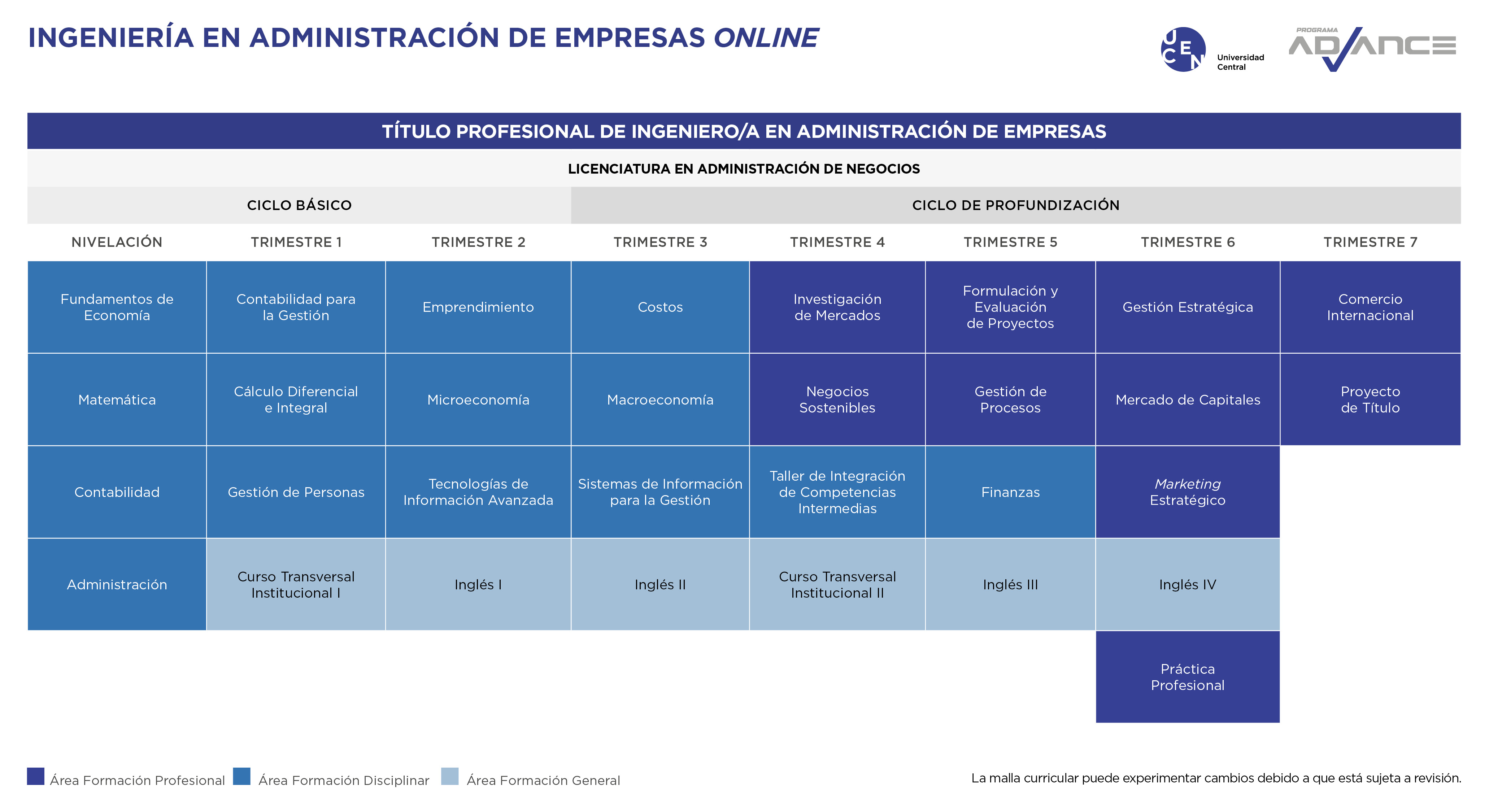 El programa Advance Ingeniería en Administración de Empresas de la UCEN te transforma en un profesional con pensamiento crítico y comunicación efectiva, que gestiona de manera eficiente los recursos financieros, los procesos operativos de marketing y personas en diversas organizaciones y emprendimientos propios.