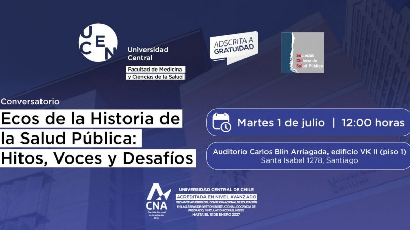 El próximo martes 01 de julio a las 12:00 horas, se realizará en el Auditorio Carlos Blin Arriagada el conversatorio "Ecos de la Historia de la Salud Pública: Hitos, voces y desafíos", una instancia de reflexión que invita a revisar los momentos clave, las voces influyentes y los retos actuales de la salud pública en Chile.