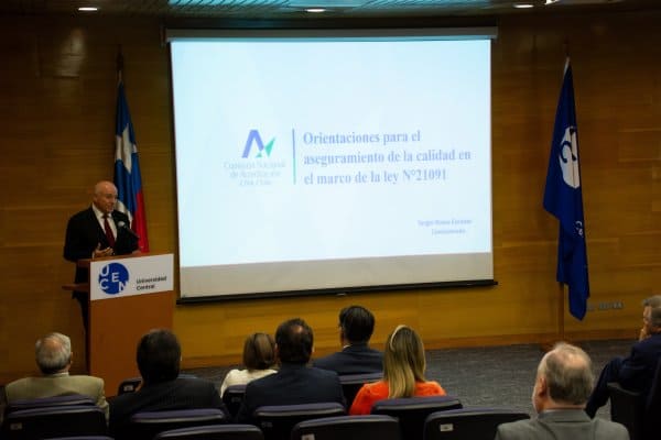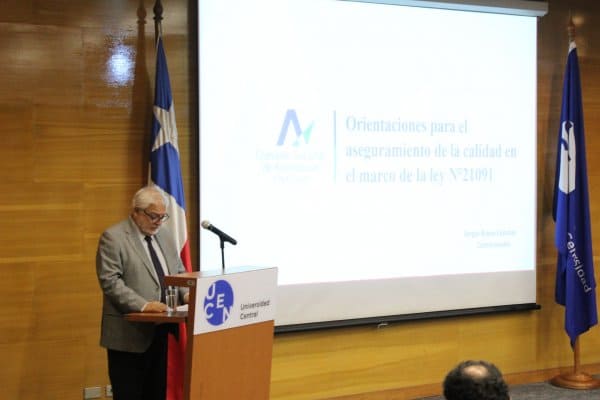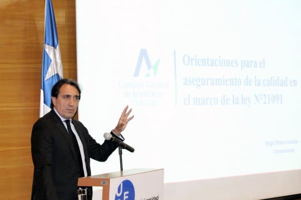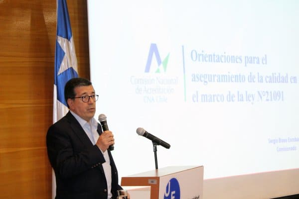 El martes 21 y el jueves 23 de marzo, se llevó a cabo la visita y presentación del comisionado de la CNA, Prof. Sergio Bravo Escobar quien abordó el tema “Orientaciones para el aseguramiento de la calidad en el marco de la ley n°21.091”. La actividad, que se desarrolló en el Auditorio Carlos Blin Arriagada del edificio Vicente Kovacevic II y que fue organizada por la Dirección de Aseguramiento a la Calidad (DAC) junto a la Vicerrectoría de Desarrollo Institucional, se enmarcó en el desarrollo de un ciclo de charlas y talleres, cuyo único propósito es el proceso de aseguramiento y dar a conocer los nuevo criterios y estándares de la calidad establecidos por la CNA.