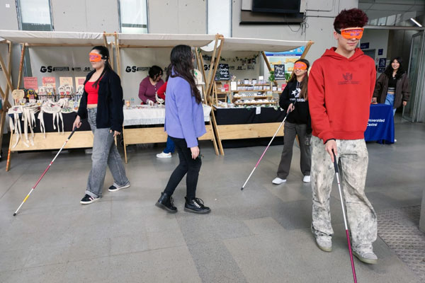 Por su parte, Pía Muñoz, profesora diferencial especialista en discapacidad visual, comentó: «El 15 de octubre celebramos el Día del Bastón Blanco, que simboliza autonomía e independencia para las personas en situación de discapacidad visual. Quisimos conmemorarlo con la actividad “Ponte en mi lugar”, donde muchos estudiantes se animaron a participar y aprender sobre el uso del bastón y las técnicas de orientación y movilidad. Fue una experiencia muy enriquecedora y participativa; además, contamos con el apoyo de las estudiantes de Trabajo Social, que ayudaron a difundir material educativo y a sensibilizar a la comunidad universitaria».