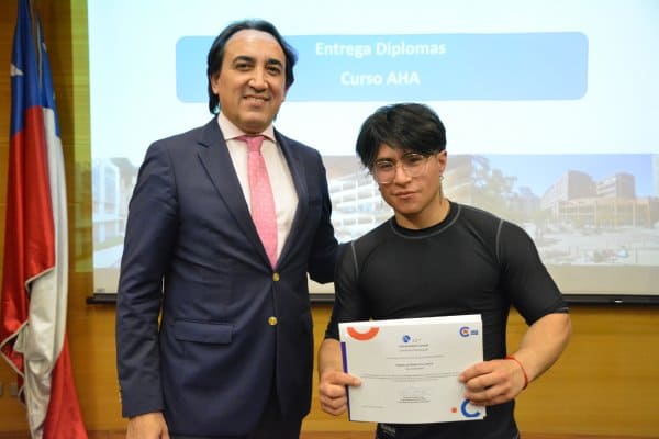 A continuación, el rector Santiago González, junto al vicerrector académico, Emilio Oñate, hicieron entrega de los diplomas a las y los estudiantes que fueron capacitados por el Centro AHA en cursos de primeros auxilios y reanimación cardiopulmonar: