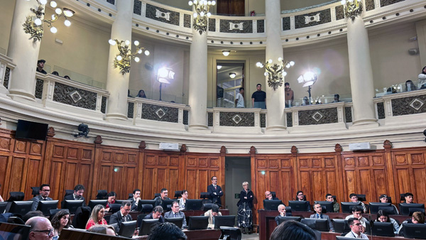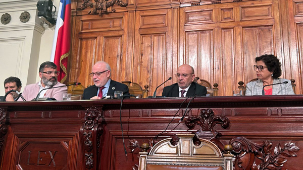 A continuación, el académico y miembro de la Junta Directiva de la U. Central, Marco Moreno, presentó el panel de conversación, dando la palabra al rector Santiago González, quien agradeció la invitación del senador Castro y la presencia de las autoridades y panelistas.
