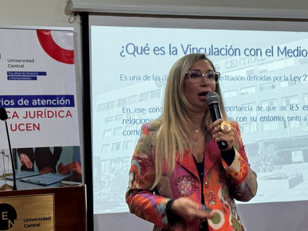 Docentes y estudiantes de la asignatura Clínica Jurídica I de Derecho diurno y vespertino participaron por primera vez de una inducción sobre la metodología Aprendizaje+Servicio (A+S), instancia que contó con la presencia de la directora de Vinculación con el Medio (VcM) de la Universidad Central, Claudia Contreras; del coordinador de la Metodología A+S a nivel institucional, Darwin Lillo; la directora de Derecho, Maite Arauco; la directora de la Clínica Jurídica, Daniela Pizarro; y el coordinador de VcM de la Facultad de Derecho y Humanidades, Samuel Erices.