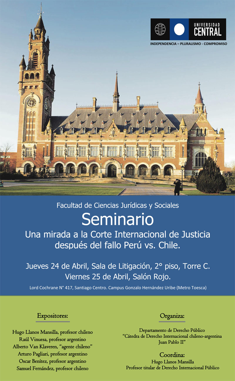 La actividad se desarrollará los días 24 y 25 de abril a partir de las 9:30 AM y contará con la participación de actores y expertos de primera línea en el ámbito del derecho internacional. Entre los expositores destacan Alberto Van Klaveren y Raúl Vinuesa, respectivos agentes de Chile y Argentina ante la Corte Internacional de Justicia. La apertura del seminario, en tanto, estará en manos del Subsecretario de Relaciones Exteriores, Edgardo Riveros, y el Decano de la Facultad de Ciencias Jurídicas y Sociales (FCJS), Andrés Naudon.