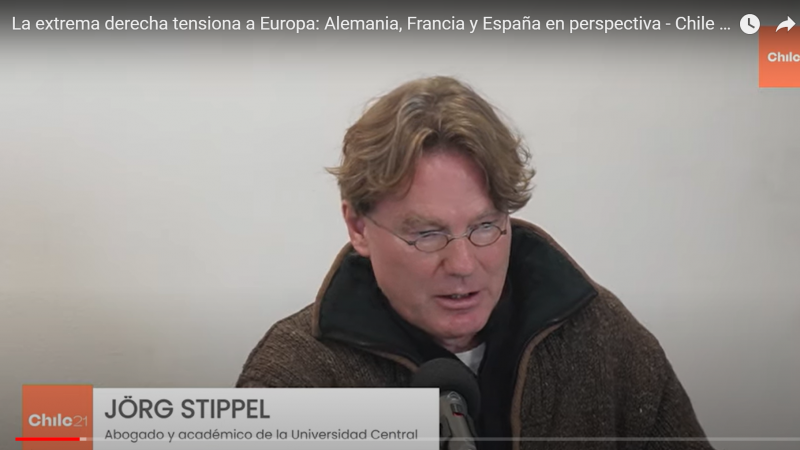 El lunes 17 de junio el académico del Claustro del Doctorado en Derecho, Jörg Stippel, participó en el conversatorio “La extrema derecha tensiona a Europa: Alemania, Francia y España en perspectiva”, organizado por la Fundación Chile21 y el Foro Permanente de Política Exterior.