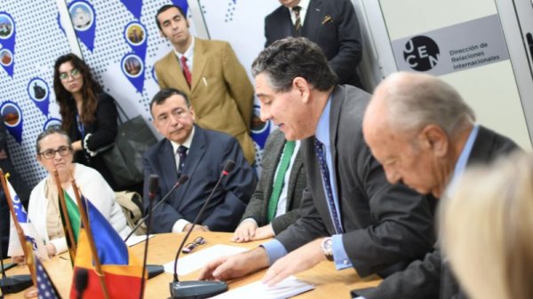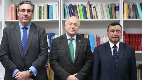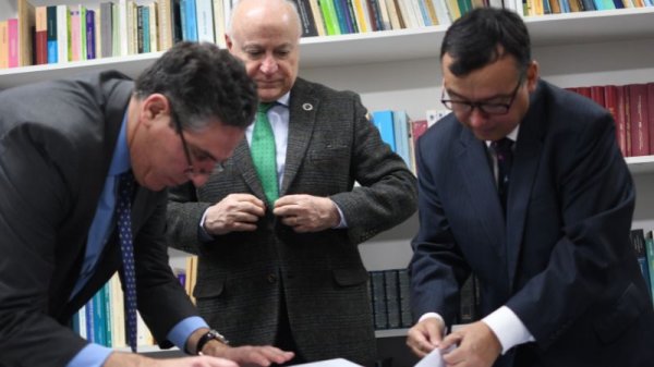 Posteriormente, se formalizó la donación de la “Colección Hugo Llanos Mansilla” a la Biblioteca del Doctorado en Derecho. Más de 400 ejemplares de la colección personal del académico, recolectados a lo largo de toda su vida, ahora quedarán disponibles para futuras generaciones de estudiantes e investigadores de la Universidad Central. La recepción de la donación fue oficializada mediante la firma de un acta por parte del rector, el decano y el embajador Llanos.