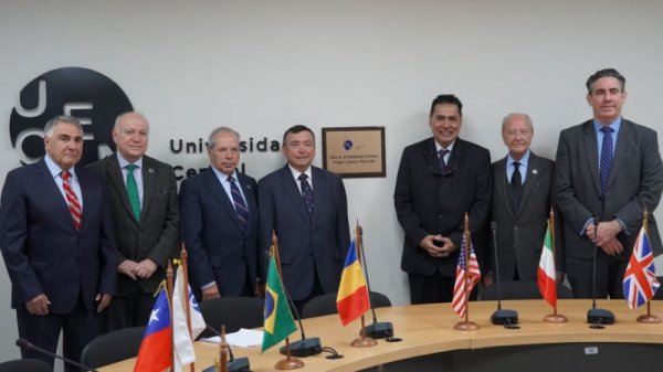 Por su parte, el decano de la Facultad de Derecho y Humanidades, Rafael Pastor Besoain, valoró el sentido profundo de este homenaje: “no es cualquier sala. Es la sala de la Dirección de Relaciones Internacionales, que evidentemente permite una coherencia perfecta entre lo que fue el desarrollo académico y profesional del profesor Hugo Llanos en el país, pero también en la Universidad Central. Creo que es muy importante para la universidad como una institución que aspira a la duración y a la permanencia, que sus docentes queden inmortalizados, especialmente cuando tienen el mérito para ello en estos edificios”.