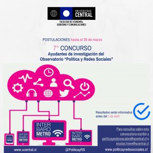 Hasta el 29 de marzo estarán abiertas las postulaciones para el séptimo concurso que busca ayudantes de investigación para trabajar en el Observatorio “Política y Redes Sociales”, proyecto que tiene como objetivo analizar la conversación pública y política en el mundo digital, en sus distintas perspectivas y coyunturas, así como las nuevas formas de gobernar y de comunicación política en la sociedad red.