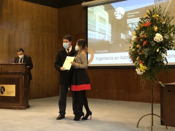 Riveros también se refirió a la especial coyuntura económica, política y social que se constituye en el escenario en que deberán actuar los nuevos egresados y egresadas de la UCEN, señalando que “estamos enfrentando más incertidumbre, más riesgos, una economía global con severas complicaciones y eso afecta en las decisiones de las empresas, por pequeña, mediana o grande que sea, entonces, hoy se requiere de ustedes competencias muy actualizadas en materias de riesgo financiero, economía internacional, manejo de personas (…) pero ustedes ya están probados y eso es lo que certifica ese diploma que tienen en sus manos”.