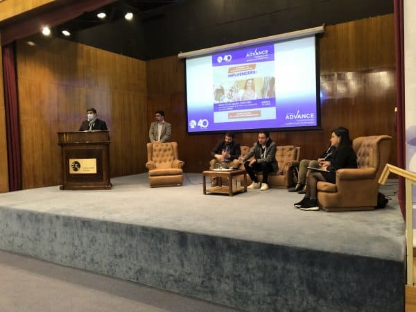 “Influencers: desde el follower hasta la profesión”, se tituló el encuentro que reunió a Antonia Larraín, comunicadora y activista por la diversidad corporal, autora del libro Cuerpo sin Vergüenza; Juan Vallejos Croquevielle, periodista especializado en política, redes sociales y comunicación digital; Rodrigo Mayorga, director de fundación Momento Constituyente; y Gonzalo Argandoña, periodista científico, director ejecutivo de Cábala Films.