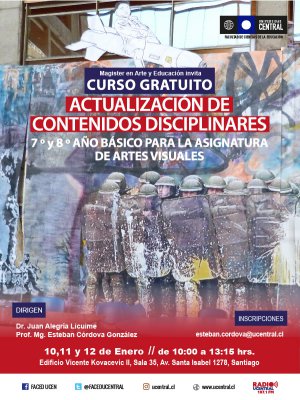 El Magíster en Arte y Educación dictará el "Curso de Actualización en Artes Visuales para 7º y 8º básico". La relevancia de esta actividad se basa en las transformaciones curriculares propiciadas por el Mineduc y su respectiva modificación de las bases curriculares, que hacen necesario que los actores educativos ligados a las artes, puedan conocer y capacitarse en las últimas innovaciones y cambios que se presentan.