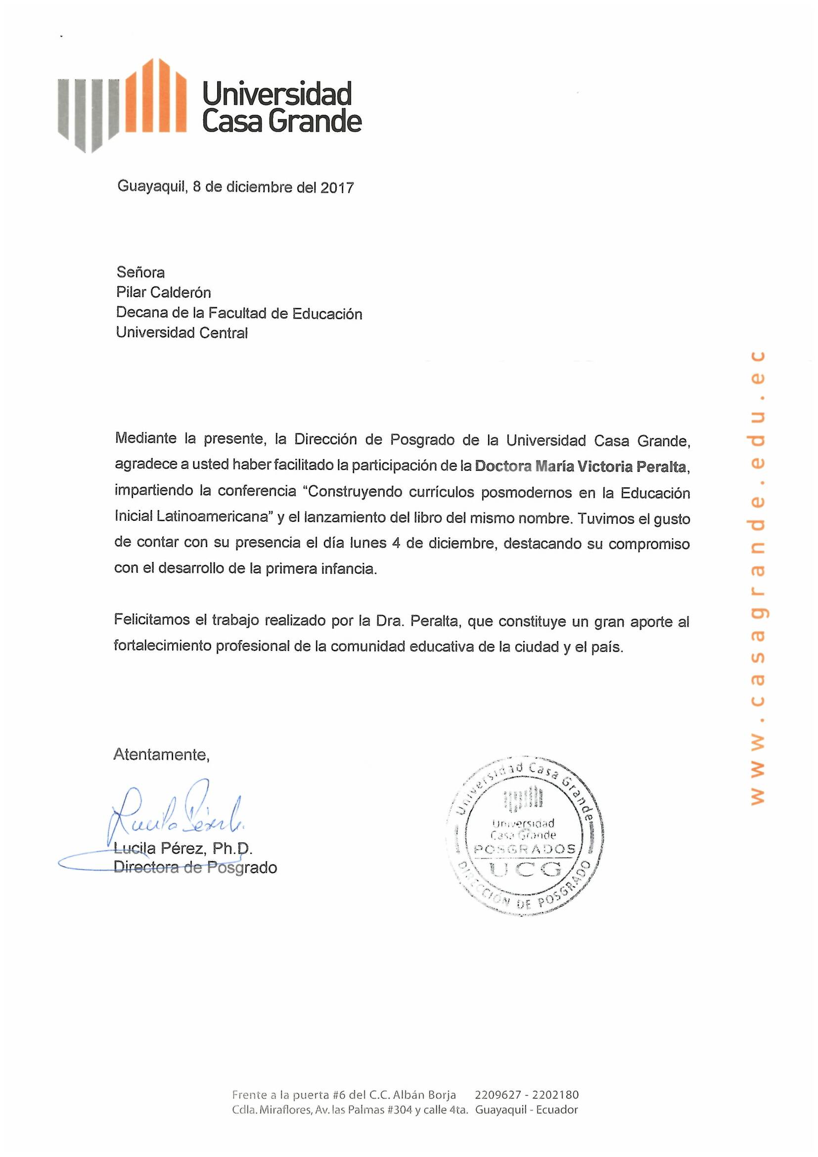 Agradecidos por la participación de la profesora Peralta en la casa de estudios del Ecuador, la directora de postgrado, Lucila Pérez, manifestó a través de una carta dirigida a la decana de la Facultad de Ciencias de la Educación, Pilar Calderón, su agradecimiento por la participación y aporte de la Dra Peralta al "fortalecimiento de la comunidad educativa de la ciudad y el país".