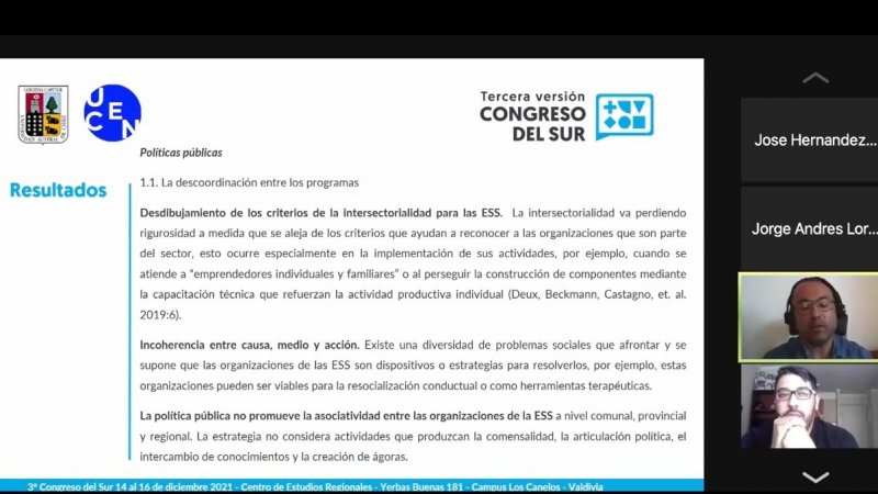 La segunda actividad en la que fue representada la UCEN, se realizó en la ciudad de Valdivia del 14 al 16 de diciembre, oportunidad en la que el académico realizó la ponencia: “Políticas públicas y organizaciones de las economías sociales y solidarias en los borradores del Grupo de Trabajo Interinstitucional sobre Economía Social y Solidaria”, en la mesa dedicada a “Territorios y Economías Plurales” del Congreso del Sur 2021, organizado por el Centro de Estudios Regionales, la Dirección de Vinculación con el Medio, la Facultad de Ciencias Económicas y Administrativas, el Instituto de Administración y la Escuela de Administración Pública de la Universidad Austral de Chile.