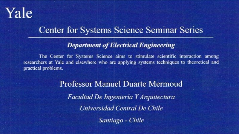 El profesor e investigador, Manuel Duarte, dictó una charla en la prestigiosa Universidad de Yale en la que trató sus recientes avances de las investigaciones en el área de operadores fraccionales aplicados al control de sistemas dinámicos en la exposición llamada "Fractional Order Control and Identification: Theory and Applications".