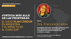 En tal contexto, la dra. Francesca Lessa, investigadora del Centro de Estudios Latinoamericanos Marie Skłodowska-Curie de la Universidad de Oxford y consultora internacional del Observatorio Luz Ibarburu, Uruguay, dictará la ponencia "Justicia más allá de las fronteras: El juicio Plan Cóndor en Argentina y su impacto en el Cono Sur"