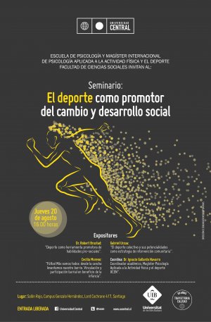 La Escuela de Psicología y el Magister Internacional en Psicología Aplicada a la Actividad Física y el Deporte de la Universidad Central de Chile, en conjunto con la Universidad de Isla Baleares/España realizarán el jueves 20 de agosto el seminario "El deporte como promotor del cambio y desarrollo social".