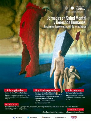 - 28 y 29 de septiembre: Curso de Actualización en Salud Mental y Derechos Humanos desde la Perspectiva de los psiquiatrizados y expertos por experiencia. Lugar: Universidad Central (Lord Cochrane 417)