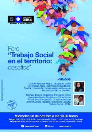La Escuela de Trabajo Social de FACSO realizará el próximo 28 de octubre un foro que tiene como principal objetivo que los estudiantes conozcan una experiencia de trabajo social territorial desde el gobierno local, mediante la presentación de destacados profesionales en ejercicio en el área.