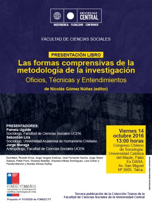 El viernes 14 de octubre de 2016, en el marco del 9º Congreso de Sociología, la Facultad de Ciencias Sociales presentará la tercera publicación de su colección Trazos. Se trata del libro: "Las formas comprensivas de la metodología de la investigación. Oficios, Técnicas y Entendimientos" que tiene a Nicolás Gómez Nuñez, académico de la Escuela de Sociología de la UCEN, como editor.