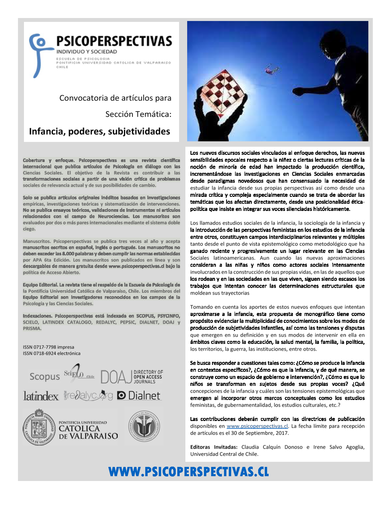 El tema será “Infancia, poderes y subjetividad”. La fecha límite para recepción de artículos es el 30 de Septiembre, 2017.