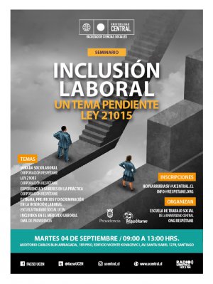 El martes 4 de septiembre se realizará en la Universidad Central el Seminario "Inclusión Laboral ¡Un tema Pendiente! Ley 21015", en el marco de actividades de colaboración entre la Escuela de Trabajo Social de la Facultad de Ciencias Sociales (FACSO) y la ONG Respétame.