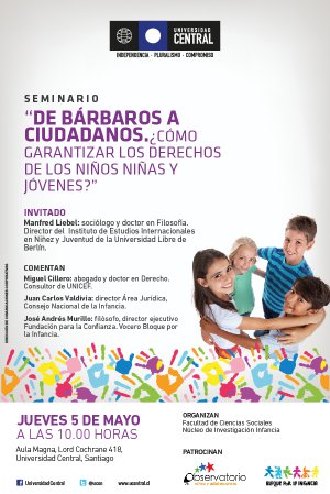 La Facultad de Ciencias Sociales y el Núcleo de Investigación Infancia de la Universidad Central realizarán el jueves 5 de mayo en el Aula Magna el seminario "De bárbaros a ciudadanos. ¿Cómo garantizar los derechos de los niños niñas y jóvenes?".