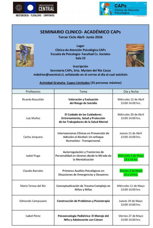 - Jueves 5 de mayo de 13 a 14 horas: "Primeros Auxilios Psicológicos en Situaciones de Emergencias y Desastres", con el profesor Claudio Barrales.