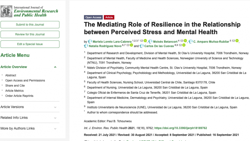 El trabajo en investigación internacional (chileno, noruego y español), iniciado durante 2018 (Ver Aquí) ha logrado durante 2021 su primer indicador de alto impacto, publicando en la International Journal of Environmental Research and Public Health para el tópico Burden of COVID-19 in Different Countries con el artículo The Mediating Role of Resilience in the Relationship between Perceived Stress and Mental Health