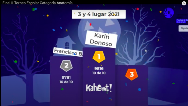 El cuarto lugar de la contienda, fue para Francisco Burgos alumno de cuarto medio del colegio Liceo Bicentenario Enrique Ballacey Cottereau de Angol, el tercer lugar fue para Karin Donoso, quien también obtuvo el mismo puesto en la categoría Histología. El segundo lugar fue para el estudiante de cuarto medio Cristóbal Corday del Instituto Nacional, quien además fue ganador de la categoría Histología. El primer lugar quedó en manos del estudiante Benjamín Alejandro Guajardo del Instituto San Pablo Misionero.