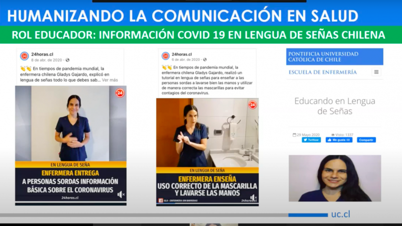 La conferencia Humanizando la Comunicación en Salud, organizada por la carrera de Enfermería tuvo como invitada a la Enfermera de Unidad de Pacientes Críticos Red de Salud UC Christus Gladys Gajardo, quien expuso acerca del trabajo en la Enfermería en tiempos de pandemia, donde se cumplen distintos roles, siendo la comunicación uno de los más importantes. Bajo ese contexto, contó acerca de su experiencia profesional en la UPC Adulto Hospital Clínico, en Informática clínica y normativa sanitaria. Luego estudió intérprete de lenguas de señas chilenas y actualmente se desempeña como enfermera de enlace, que es un rol fundamental sobre todo en crisis sanitaria, que tiene que ver con la comunicación entre la familia y paciente, realizando además un rol educativo.