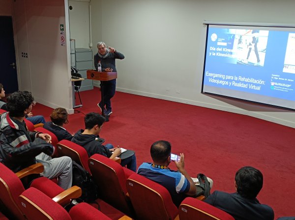 La primera exposición estuvo a cargo de Nelson Adrian, Kinesiólogo, Licenciado en Kinesiología. Doctor of Physical Therapy (ISPI, USA). Magister en Ciencias de la Salud y el Deporte, mención Kinesiología Deportiva Postítulo en Realidad Virtual, Realidad Mixta y Realidad Aumentada (MIT, USA), quien presentó sobre “Exergaming para la rehabilitación: VideoJuegos y Realidad Virtual”.