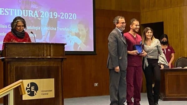 El coordinador de la especialidad de Bioanálisis Clínico, Hematología y Medicina Transfusional profesor Rodrigo Munizaga Ramos, entregó un reconocimiento al mejor rendimiento de la generación 2019 durante el ciclo básico al estudiante Matías Ahumada Morales. El segundo premio fue para la estudiante que obtuvo el mejor rendimiento de la generación 2020 durante el ciclo básico Daniela Salazar Carrasco.