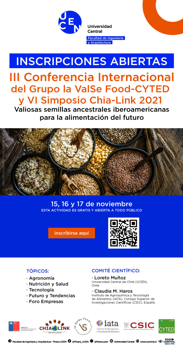 Este año, la Universidad Central será la sede del evento: ‘“III Conferencia Internacional del Grupo la Valse Food-CYTED y VI Simposio Chia-Link 2021”, titulada Valiosas semillas ancestrales para la alimentación del futuro, instancia que se celebra cada año en los diferentes países Iberoamericanos que conforman la Red Iberoamericana la ValSe-Food.