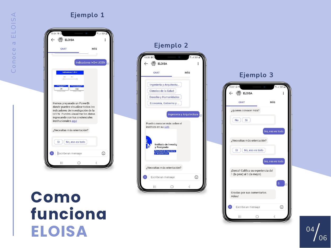 ELOISA es el BOT de la Subdirección de I+D+I, diseñado para operar sobre Microsft Teams, y destinado a orientar a la comunidad UCEN en materia de I+D+i.