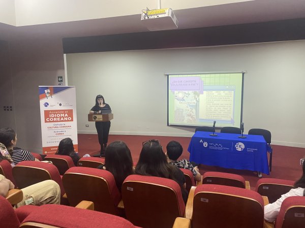 Luego, el seminario tuvo la participación de Juan Eduardo Bustos, estudiante del curso intermedio 1A del Instituto, y quien recientemente participó en el programa “Experiencia Cultural en Corea para Estudiantes Sobresalientes de KSI 2023” de la Fundación Instituto Rey Sejong. Este programa exclusivo, que tuvo lugar en Corea del Sur, fue el premio que recibió tras obtener el primer lugar en el Concurso de Oratoria en Coreano 2023. En su exposición, Juan Eduardo nos comentó sobre su visita al Museo del Hangeul y los diversos lugares tradicionales que pudo conocer mientras compartía con 168 estudiantes de 67 países que cuentan con Institutos Rey Sejong.