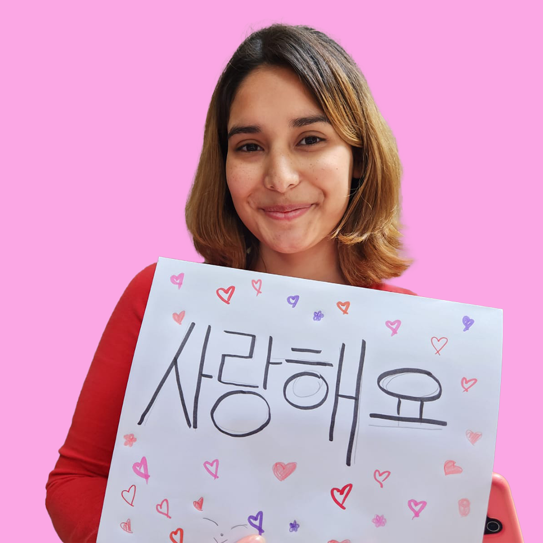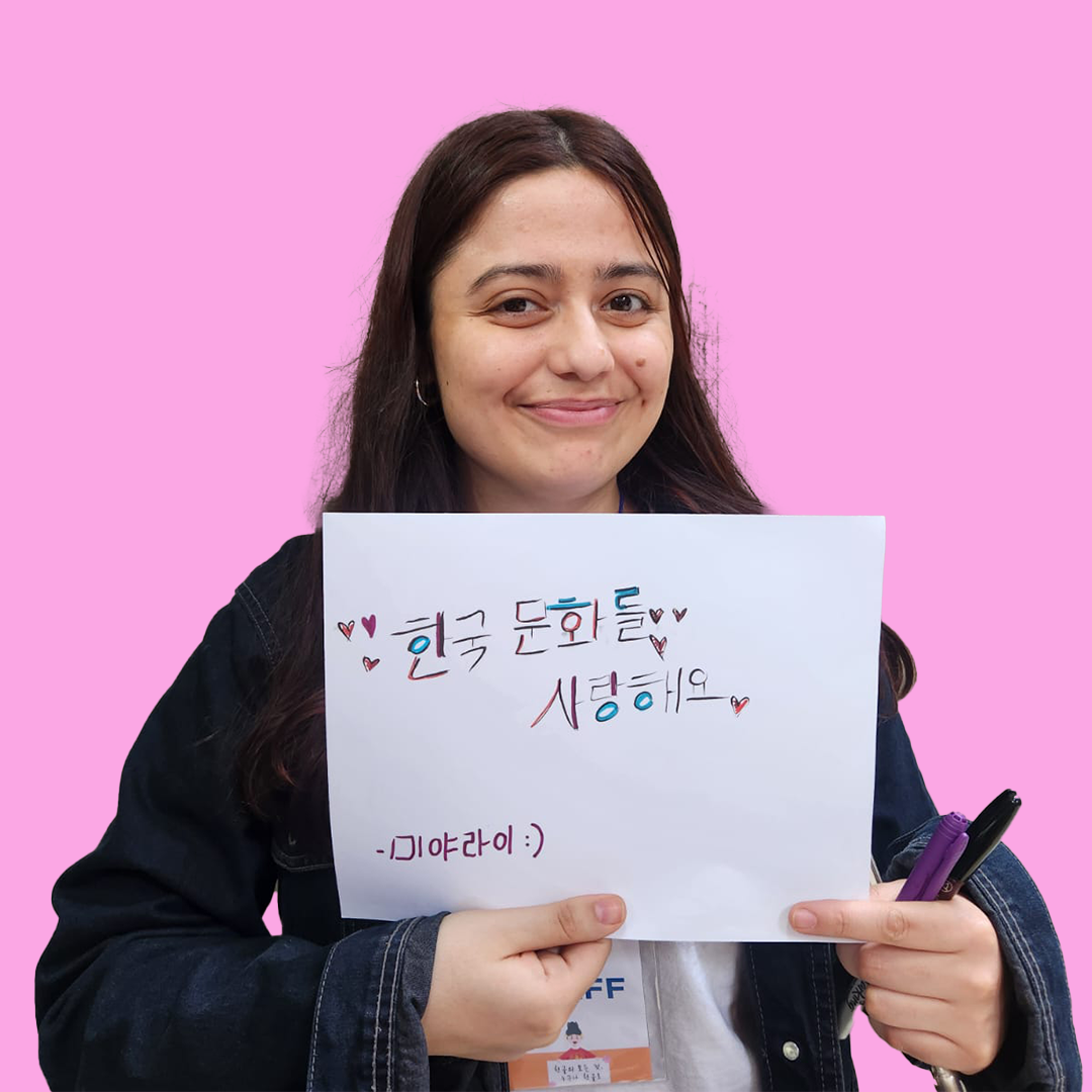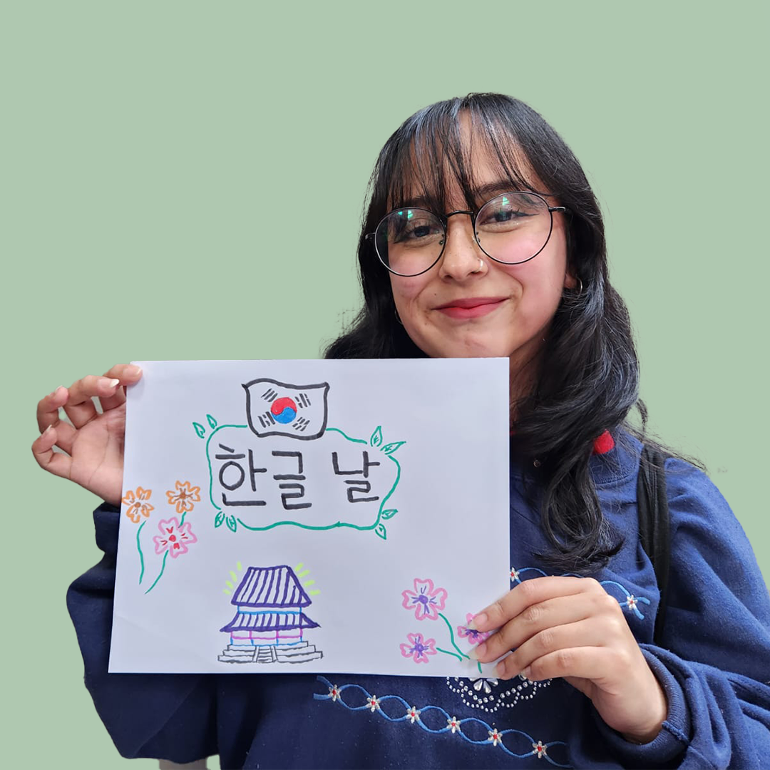 El mural "Día del Hangeul" es un lienzo digital que se creó a partir de las fotografías tomadas de los asistentes en el stand de pancartas durante la celebración del Día del Hangeul 2024. En cada pancarta, los participantes expresaron sus saludos y felicitaciones en conmemoración de los 578 años de la proclamación del alfabeto coreano, el hangeul. Este mural no solo celebra la rica historia del hangeul, sino que también refleja la participación activa y el entusiasmo de la comunidad en este importante evento cultural.